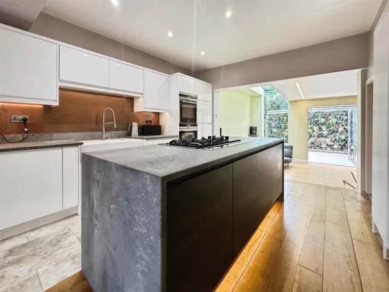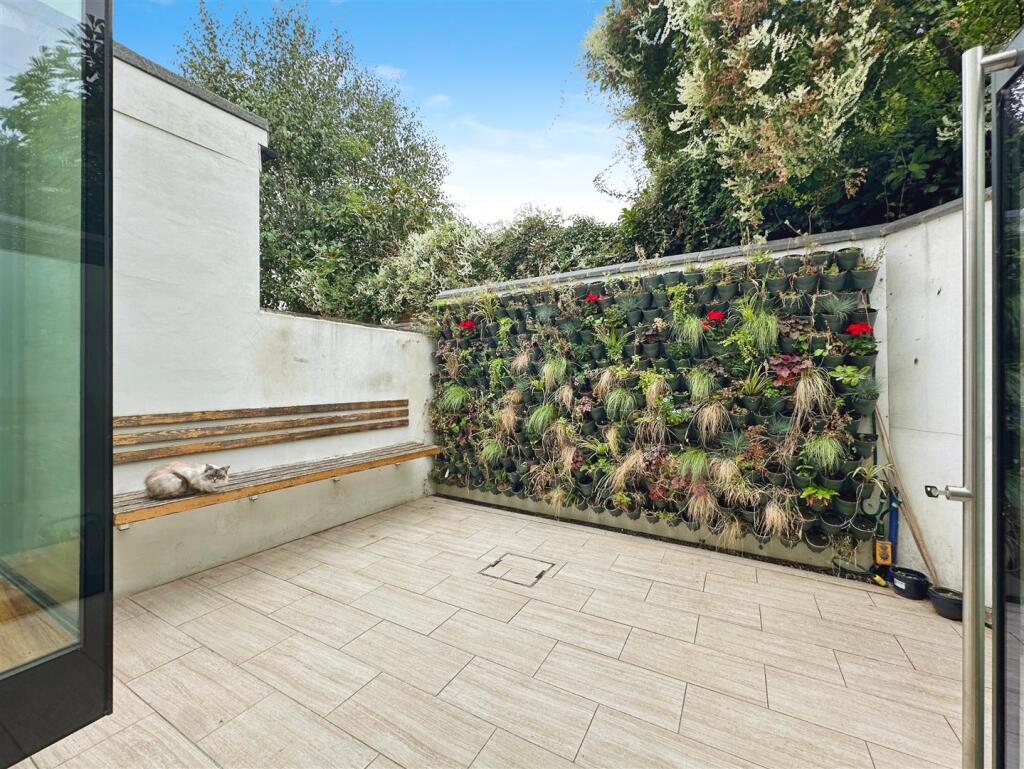 The extension incorporates interesting glass features such as a single large door and a protruding glass bay flowing into a glazed strip section. The garden also features a green wall which provides a softer, natural attribute that contrasts the bright, clean lines of the glazing.